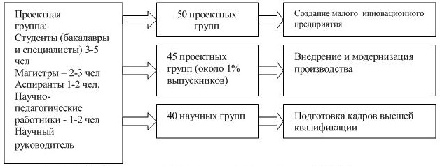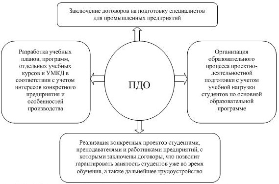 Проектно-деятельностное образование позволяет готовить инновационно-ориентированных специалистов высокого уровня, способных без дополнительной переподготовки на производстве решать конкретные задачи предприятия-заказчика, в том числе проводить научные исследования и разрабатывать бизнес ориентированные проекты, в том числе и с участием студентов. Интегрирование с вузовской наукой позволяет формировать из таких специалистов бизнес-ячейки, как самостоятельные, так и в рамках действующего производства, привлекая их в качестве новой рабочей силы в малые предприятия на базе университета.