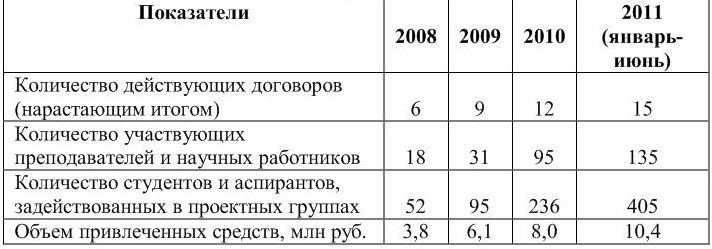 В рамках проектно-деятельностной подготовки заключено 15 договоров с различными предприятиями и организациями, создано более 20 малых предприятий, 14 кафедр университета ввели новые дисциплины, возникшие в ходе реализации проектов (см. табл. 1.2).