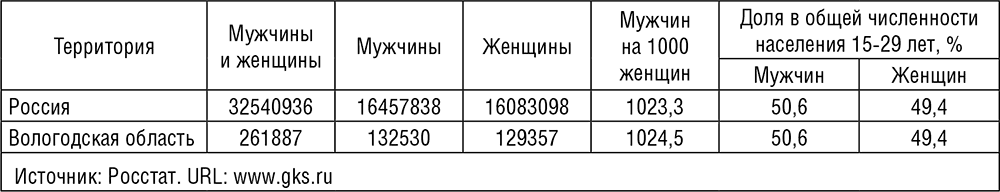 Доля молодежи в населении России в период от переписи 1926 г. до 2012 г. снизилась с 29 до 22 %. Аналогичная тенденция характерна для большинства развитых стран, находящихся на 3–4 стадии демографического перехода. По данным Всероссийской переписи 2010 г. доля молодого населения страны составила 22,8 %; в Вологодской области – 23,3 %. Больше молодых людей проживает в городской местности, где удельный вес населения 15–29 лет составляет – 23,3 %, тогда как в сельской – 21,4 %.