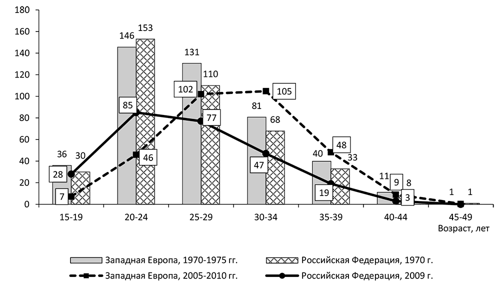 Рис. 1.1.2. Возрастные коэффициенты рождаемости в странах Западной Европы и Российской Федерации, на 1000 женщин соответствующего возраста