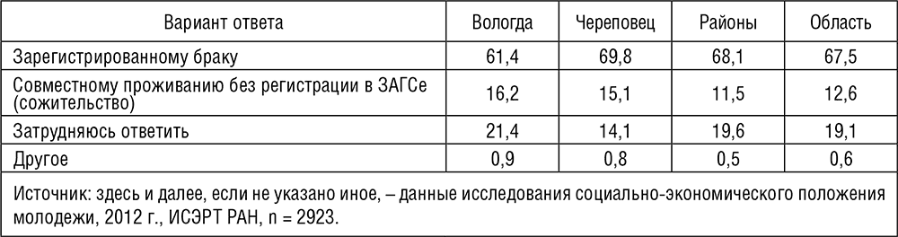 Оценить изменения, происходящие в демографическом поведении на микроуровне, возможно с помощью социологических методов. В 2012 г. ИСЭРТ РАН проведен массовый опрос молодежи Вологодской области. Одной из практических задач было исследование демографических установок молодежи, их особенностей, в том числе территориальных. Были опрошены 2923 человека в 28 муниципальных образованиях области (2 крупных города: г. Вологда – административный центр, г. Череповец – промышленный моногород и 26 муниципальных районов с преимущественно сельским населением). Выборка квотная по полу и возрасту, ошибка не превышает 3 %. Обследование позволило изучить матримониальные и репродуктивные установки молодежи и их трансформацию.