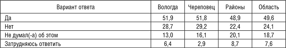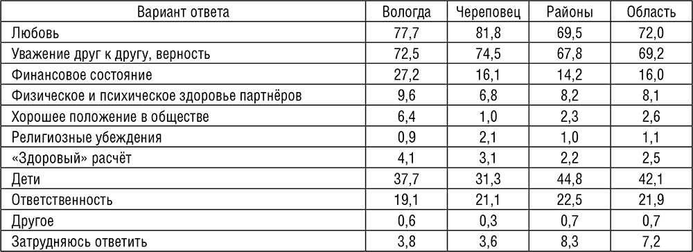 Основой брака молодые люди единодушно считают любовь, уважение друг к другу, наличие детей. Однако в территориальном разрезе заметны отличия, которые можно интерпретировать как больший прагматизм сельской молодежи по отношению к браку, большую ориентированность на детей как атрибутивный признак семьи, что свидетельствует о большей значимости социальных и экономических репродуктивных мотивов в сельской местности. Для жителей г. Вологды гораздо большее значение имеет финансовое положение (27 %), тогда как существенная часть череповчан, считающихся более практичными, продемонстрировали весьма романтичное представление об основе брачного союза (табл. 1.1.3).