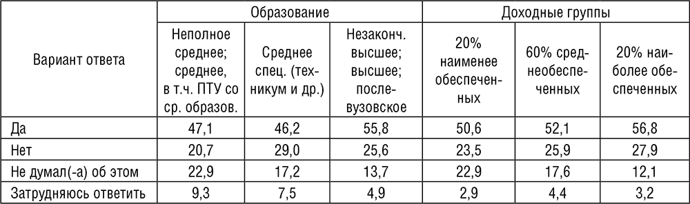 Таблица 1.1.5. Распределение ответов на вопрос: «Считаете ли Вы вступление в брак обязательным условием для воспитания детей?» (по уровню образования и доходным группам), в % от числа опрошенных