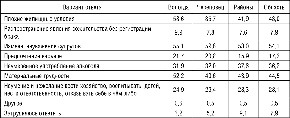 О происходящих трансформациях репродуктивного и брачного поведения, обусловленных социально-экономическими изменениями в жизни общества, свидетельствует характер причин, которые сегодня ведут к разрушению семьи или мешают ее созданию. Например, по мнению 43 и 45 % респондентов соответственно, к этим причинам относятся плохие жилищные условия и материальные трудности. Высока доля тех, кто отметил такие социокультурные факторы, как измена, пьянство, неумение вести хозяйство, нести ответственность, а также предпочтение карьере (табл. 1.1.6).