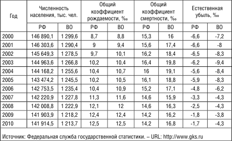 Уровень рождаемости в Вологодской области соответствует среднероссийскому (за 2000–2010 гг. увеличился с 8,8 до 12,5‰), однако он ниже, чем необходимо даже для замещения новыми поколениями родительских когорт, что не позволяет преодолеть снижение численности населения (табл. 1). В результате за 11 лет численность населения в Вологодской области уменьшилась на 85 954 человек или на 6,6 % (в 2010 г. – 1 213,7 тыс чел.), что значительно превышает показатели по стране: за указанный период численность населения в России сократилась на 3,4 % (в 2010 г. – 141 914,5 тыс. чел.).