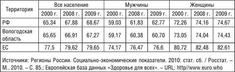 Несмотря на повышение в 2000–2009 гг. продолжительности жизни как в Вологодской области (почти на 2 года), так и в России (в среднем на 3 года), отставание от Европейского Союза составляет 12 и 11 лет соответственно (табл. 2).