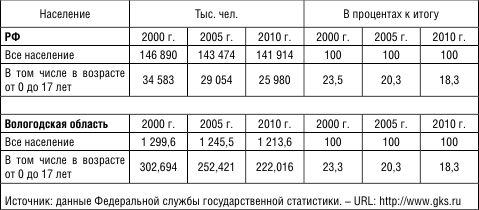 Динамика изменения возрастной структуры населения показала, что за последние 11 лет (с 2000 по 2010-й) удельный вес детей в общей численности населения Вологодской области сократился с 23,3 до 18,3 % (табл. 3). Аналогичная ситуация складывается и по стране в целом, где за указанный период доля детей и подростков (в возрасте от 0 до 17 лет) уменьшилась на 5 процентных пунктов (с 23,5 до 18,3 %).