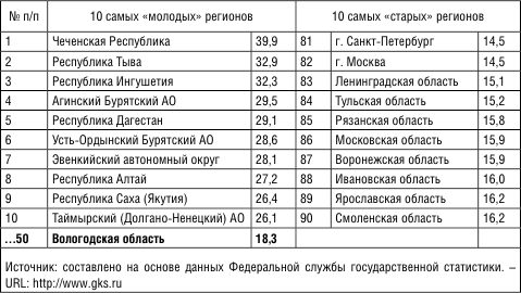 В возрастном составе населения видны и региональные различия. Самые «молодые» регионы России удалены от ее центра, «старое» население концентрируется в столицах и близлежащих регионах. Вологодская область в этом рейтинге занимает лишь 50-е место (табл. 4).