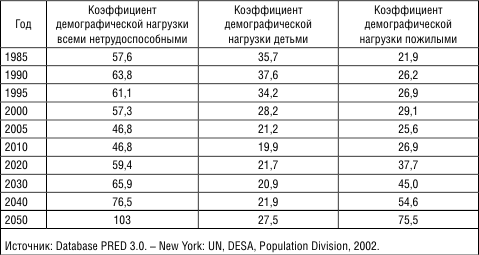 Таблица 5. Коэффициент демографической нагрузки в РФ в 1985–2050 гг. (на 100 человек трудоспособного населения)