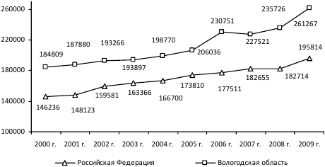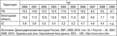 Источники: Российский статистический ежегодник. 2010: cтат. сб. / Росстат. – М., 2010; Основные показатели деятельности учреждений здравоохранения Вологодской области за 2009 год: стат. сб. – Вологда: Департамент здравоохранения Вологодской области, ГУЗ ДЗ ВО «МИАЦ», 2000–2010.