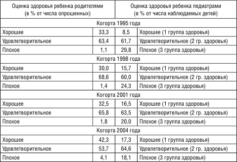 Поскольку знания и представления родителей о состоянии здоровья ребенка также не всегда соответствуют действительности, сравним родительское мнение с мнением врачей. Результат сопоставления показал: родители в 2 раза чаще, чем педиатры, оценивают здоровье детей как «хорошее». В то же время «плохим» здоровье ребенка родители называют в 6 раз реже, чем педиатры (табл. 7).