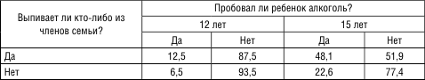 Еще одной вредной привычкой, которая может оказывать негативное влияние на здоровье детей, является чрезмерное потребление алкогольных напитков. Исследование показало, что если в семье есть практика употребления алкоголя, то 12 % детей в возрасте 12 лет и половина – в возрасте 15 лет его тоже пробовали (табл. 9).