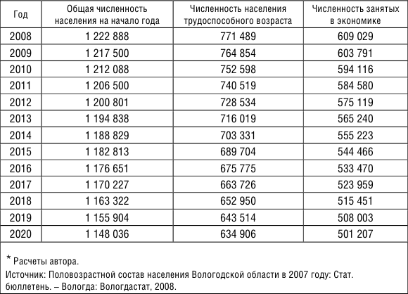 Оценка численности занятых в экономике Вологодской области в долгосрочном горизонте планирования показала, что при сохранении существующих тенденций к 2015 году значение этого показателя сократится до 544 тыс. чел., а к 2020 – до 501 тыс. чел., и это будет происходить одновременно с сокращением общей численности населения и численности населения в трудоспособном возрасте (табл. 1).