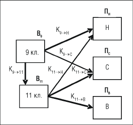 Используемая модель является многоуровневой. Моделью первого уровня служит Базовая модель взаимодействия потоков учащейся молодежи, учитывающая распределение выпускников 9-х и 11-х классов школ только текущего года выпуска и только внутри одного субъекта Федерации (рис. 2).