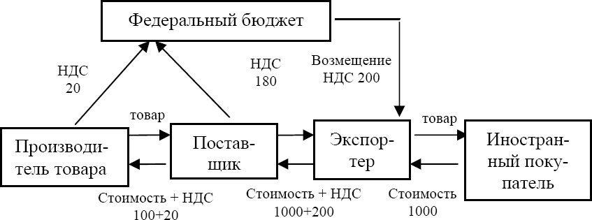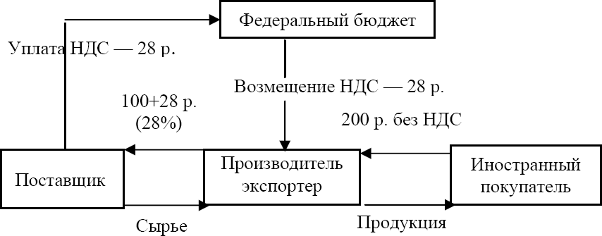 Механизм функционирования НДС может быть представлена следующим образом (см. схему 2; для простоты предполагается, что затрат у экспортера нет и он работает бесприбыльно).