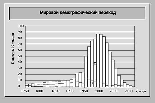 Рис. 2. Демографический переход 1750–2100 гг. Прирост населения за декады лет: 1 в развитых и 2 в развивающихся странах. (С. П. Капица. Информационное развитие общества, демографическая революция и будущее человечества, 2006).