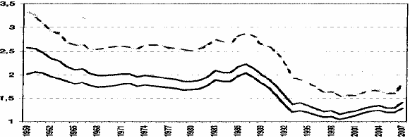 Рис. 3. Коэффициент суммарной рождаемости (см. сверху вниз) сельского, всего, городского населения России, 1959–2007. (См.: Россия перед лицом демографических вызовов, М., 2009, с. 29).
