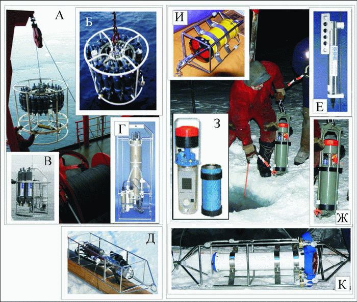 Рис. 1. Приборы и оборудование, используемые в высокоширотных экспедициях. А – комплекс SBE 32 Caroucel с зондом SBE 911plus; Б – комплекс SBE 32 Caroucel c профилографом SBE 19plus и модулем AFM; В – комплекс SBE55 ECO Water Sampler c профилографом SBE 19plus; Г – зонд SBE 9plus CTD; Д – профилограф SBE 19plus; Е – измеритель температуры и электропроводности SBE 37SM; Ж – измеритель течений RCM 9IW; З – измеритель течений Seaguard IW; И – акустический доплеровский профилограф течений WHS300; К – акустический доплеровский профилограф течений дальней зоны действия WHLS75