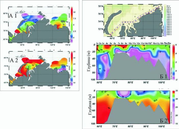 Рис. 2. Пространственные распределения гидрологических параметров (1 – температура, 2 – соленость), полученных в ходе высокоширотных судовых экспедиций с помощью измерительных комплексов SBE 19plus (А) и SBE 911plus (Б).