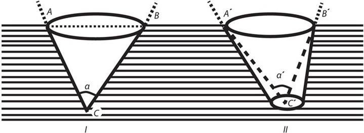 I, II – варианты формы операционной раны; АCB, А'C'B' – стенки конуса операционной раны; α, α' – углы наклона операционного действия