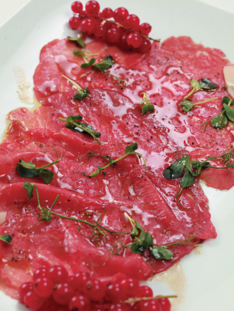 Карпаччо из оленины с кресс-салатом и смородиной