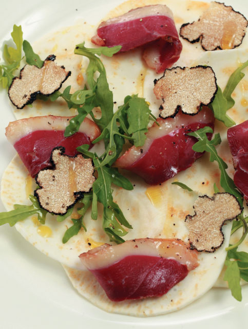 Рукколу перебрать и выложить на сельдерей, сверху – копченую утку, ломтики пармезана и нарезанного трюфеля. Сбрызнуть трюфельным маслом.