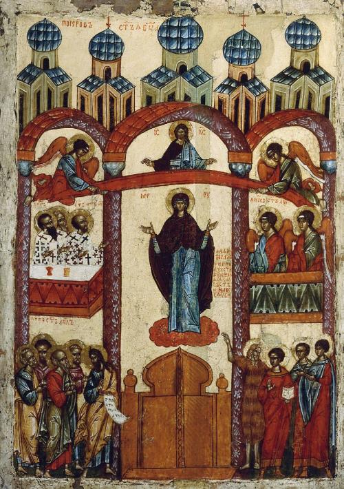 Во Влахернском храме, где хранилась бесценная реликвия – риза Богоматери и часть Ее пояса – совершалось беспрерывное моление. Однажды ночью стоявшие там Андрей Юродивый и его духовный ученик Епифаний удостоились чудесного видения. Невидимая для остальных, явилась им «величественная Жена, идущая от царских врат со страшною свитою, из которой честный [Иоанн] Предтеча и Сын Грома (апостол Иоанн Богослов. – Ю. Р.) поддерживали Ее своими руками. <…> Преклонив колени, Она долго молилась, обливая слезами Свое боговидное и пречистое лицо. <…> По окончании молитвы сняла с Себя наподобие молнии блиставшее покрывало (мафорион), которое носила на пречистой главе Своей, и, держа его с великой торжественностью Своими пречистыми руками, распростерла над всем стоящим народом. Чудесные эти мужи (Андрей и Епифаний) довольное время смотрели на это распростертое над народом покрывало и блиставшую наподобие молнии славу Господню. И, доколе была там Пресвятая Богородица, видимо было и покрывало. По отшествии же Ее, сделалось и оно невидимо. Но, взяв его с собою, Она оставила благодать бывшим там».