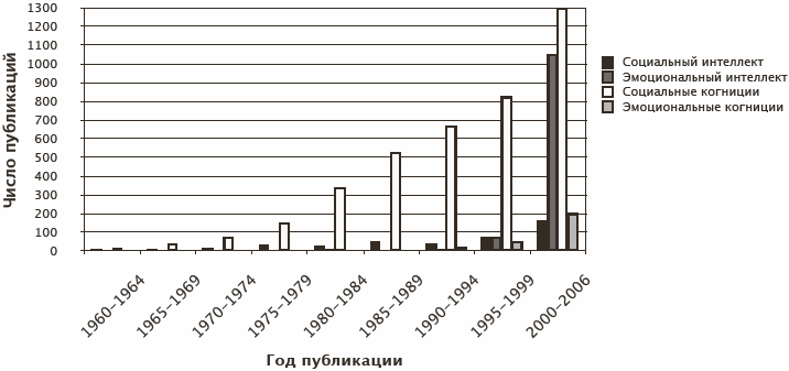 Основное изменение акцентов, отраженное в новой книге, состоит в сдвиге соотношения между работами по социальному интеллекту и эмоциональному интеллекту в пользу последнего. Следует отметить, что тенденция роста интереса к эмоциональному интеллекту в отечественной науке соответствует общемировой тенденции, хотя и с некоторой задержкой. На рисунке 1 показан рост числа публикаций по социальному и эмоциональному интеллекту, а также социальным и эмоциональным когнициям с 1960–2006 гг.