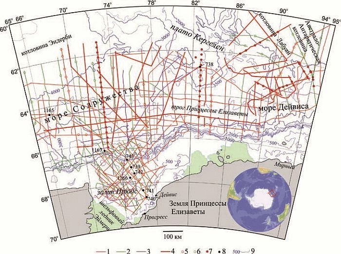 Рис. 1. Схема сейсмических исследований в море Содружества, море Дейвиса и южной части плато Кергелен. 1–4 – профили ОГТ, выполненные экспедициями СССР/РФ (1), Австралии (2), Японии (3), по проекту МПГ (4); 5–7 – пункты зондирований МПВ, выполненные экспедициями: СССР/РФ (5), Австралии (6), по проекту МПГ (7); 8 – положение скважин глубоководного бурение по проектам ODP и их номера; 9 – изобаты (в метрах)