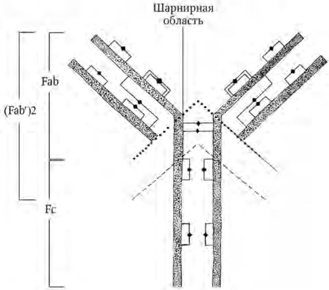 Рис. 1. Структура кроличьего иммуноглобулина IgG. Тяжелые и легкие цепи образуют вариабельный и константный домены, которые соединены дисульфидными мостиками (♦). При помощи папаина (цистеиновой эндопротеазы) протеолиз разделяет молекулу, в результате чего образуются два антигенсвязывающих фрагмента (Fab) и один кристаллизующийся фрагмент (Fc). Под действием пепсина (аспартатной кислой эндопептидазы) происходит отщепление двухвалентного антигенсвязывающего фрагмента (Fab′)2 (по: Boenisch T., 2001; с изменениями)