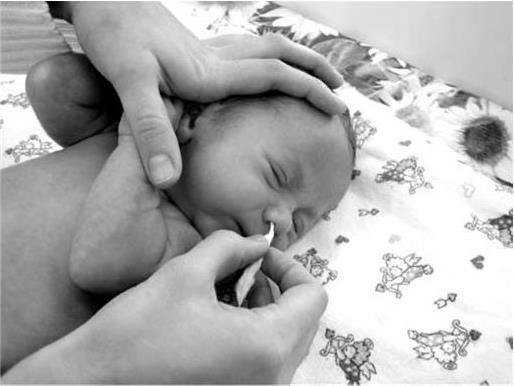 Туалет носовых ходов проводится с целью удаления сухих корочек, слизи, молока, которое может попасть туда при срыгивании. Нос прочищают ватными жгутиками, смоченными в стерильном вазелиновом масле, которые вводят в носовой ход на 1 – 1,5 см вращательными движениями. Чтобы удалить образующиеся в носу младенца корочки, вначале закапывают в каждую ноздрю теплое вазелиновое масло, а через 15 мин очищают нос ватными жгутиками.