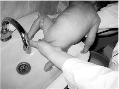 Подмывают детей теплой проточной водой при температуре 36 – 38 °C (рис. 3). Во время подмывания ребенка держат на весу, обычно в правой руке, а левой подмывают. При сильном загрязнении подмывание проводят намыленной рукой.
