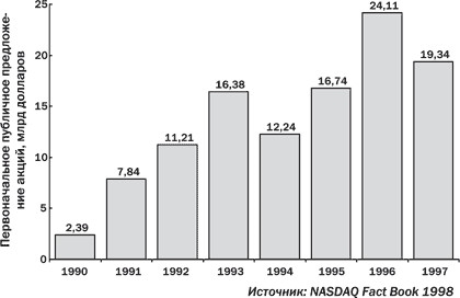Первоначальная передача денежных средств от инвесторов организациям при выпуске акций происходит на первичном рынке или рынке новых эмиссий. Поскольку акции не погашаются, организация фактически получает бессрочный заем. Когда начинается продажа акций новой компании на фондовой бирже, говорят, что капитал мобилизуется на открытом или публичном рынке. Новые эмиссии такого рода поэтому иногда называют первоначальным публичным предложением акций (Initial Public Offering – IPO). Для того чтобы разместить свои акции на открытом рынке, организация должна отвечать определенным финансовым критериям; процедура выпуска новых акций на рынок описана в разделе «Торговые операции на фондовых рынках». Организация, выпустившая новые акции в свободную продажу на бирже, вносится в так называемый «официальный лист» (официальный список котируемых ценных бумаг), т. е. включается в «листинг», становится допущенной к официальной торговле. На диаграмме показан объем денежных средств, мобилизованных через IPO на внебиржевом рынке NASDAQ с 1990 года.