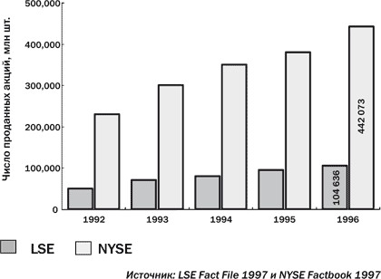 Вместе с тем подавляющий объем биржевых сделок совершается не на рынке новых эмиссий, а на вторичном рынке, где обращаются акции после первоначального выпуска. Если бы все покупатели акций держали их в ожидании дивидендов, вторичного рынка просто не существовало бы. Сопоставить число акций, обращавшихся на NYSE и LSE в 1992–1996 годах, позволяет следующая диаграмма.
