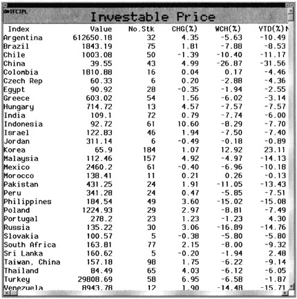 Ниже приведена таблица с одного из информационных терминалов Reuters, содержащая индексы IFC.