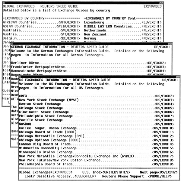 Ниже приведены примеры отображения на экране монитора информации по биржам, предоставляемой электронными службами Reuters. От этих служб вы можете получить детальную информацию по любой фондовой бирже мира.