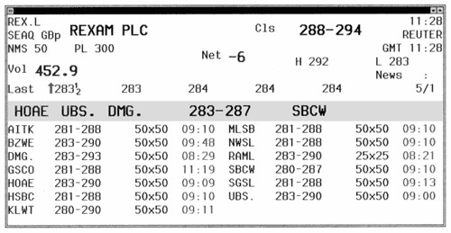 В системах на основе котировок, в частности SEAQ (детально она будет рассмотрена несколько позже), действующей на LSE в Великобритании и на NASDAQ в США, маркетмейкеры должны осуществлять непрерывную котировку цен продавцов и покупателей на включенные в листинг ценные бумаги. Котировки выводятся на экран электронной системы, с помощью которой брокеры и инвесторы могут подобрать наиболее приемлемые для себя цены. На рисунке показан вид экрана SEAQ в системе Reuters.