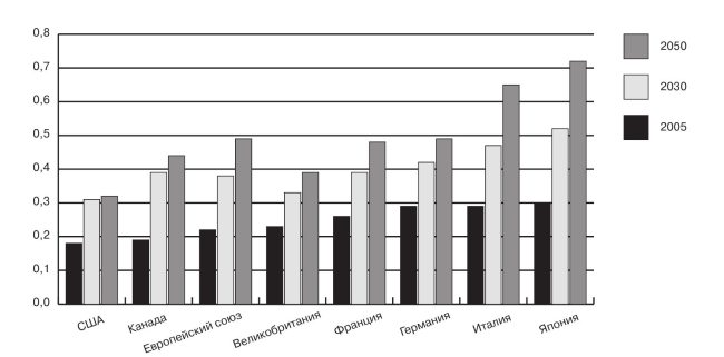 1) повышение демографической нагрузки. Во многих развитых и развивающихся странах мира наблюдается повышение коэффициента демографической нагрузки (отношение численности лиц старше 65 лет к общей численности трудоспособного населения 15–64 лет). В Европе данный показатель в 2005 г. составил 0,23 (по прогнозам в 2030 г. составит 0,37), т. е. на момент 2005 г. на одного иждивенца приходилось четыре работоспособных гражданина (к 2030 г. соотношение составит 1 к 2, рис. 1.2).