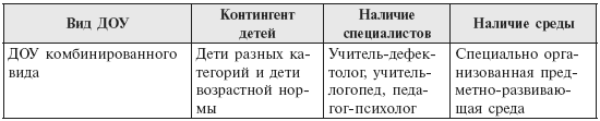 В ДОУ комбинированного вида создаются группы комбинированной направленности, реализующие инклюзивную практику. При наличии в ДОУ структурных подразделений семьям предлагаются различные образовательные маршруты и формы взаимодействия: индивидуальные формы работы с детьми, создание детско-родительских групп, консультации родителей, группы для родителей, группы кратковременного пребывания, группы полного дня. Такая организация деятельности ДОУ обусловлена наличием особых образовательных потребностей детей и диктует необходимость психолого-педагогического сопровождения детей и их родителей. Если в ДОУ выявлены 2–3 ребенка с ОВЗ и ввести в штат специалистов сопровождения невозможно, заключается договор с ППМС-центром на оказание консультативных услуг диагностики и составления индивидуальных образовательных программ для детей с ОВЗ.