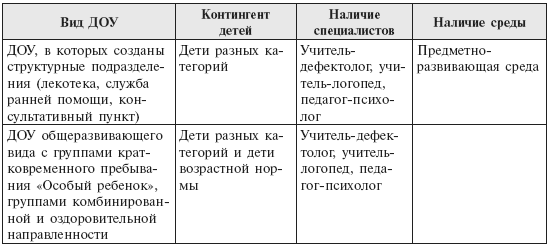 На сегодняшний день в Москве инклюзивный подход в образовании реализуется в ДОУ, работающих с разным контингентом детей и обладающих определенными ресурсами (см. таблицу 1).
