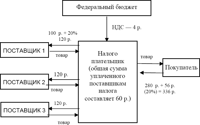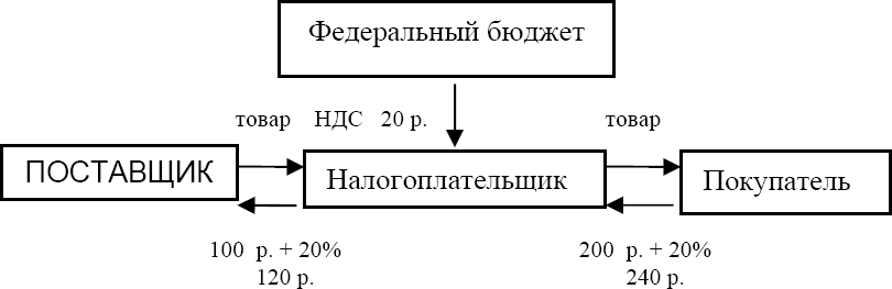 Налоговая база рассчитывается как разница между ценой продажи без НДС и налога с продаж (200 р.) и ценой покупки товара без НДС и налога с продаж (100 р.) и составляет в данном случае 100 р. Налоговую ставку принимаем за 20 %. Налоговые вычеты составляют 20 р., уплаченные налогоплательщиком поставщику. Перечислить в бюджет в виде налога на добавленную стоимость надлежит 20 р. (40–20 = 20).
