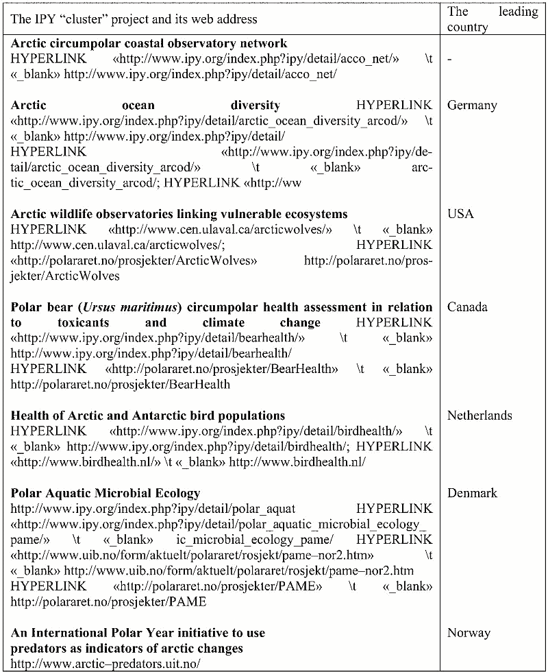 Nevertheless, Russia is widely represented exactly in the IPY International Programme. First of all, about 400 Russian scientists were invited to the IPY cluster projects, including about half of RAS and Hydromet institutions. Russian specialists are involved in all projects relating to investigations of the reaction of the circumpolar terrestrial biota and ecosystems to climate fluctuations in the Arctic, population dynamics and population composition of sea birds, semi-aquatic birds, waterfowls, wild reindeer, polar bears, pinnipeds and cetaceans, the pan-Arctic flora and vegetation and functioning of ecosystems in conditions of global warming, etc. As an example, we can name some large international IPY «clusters» devoted to the study of terrestrial and marine biota, were Russian specialists are involved (Table 2).