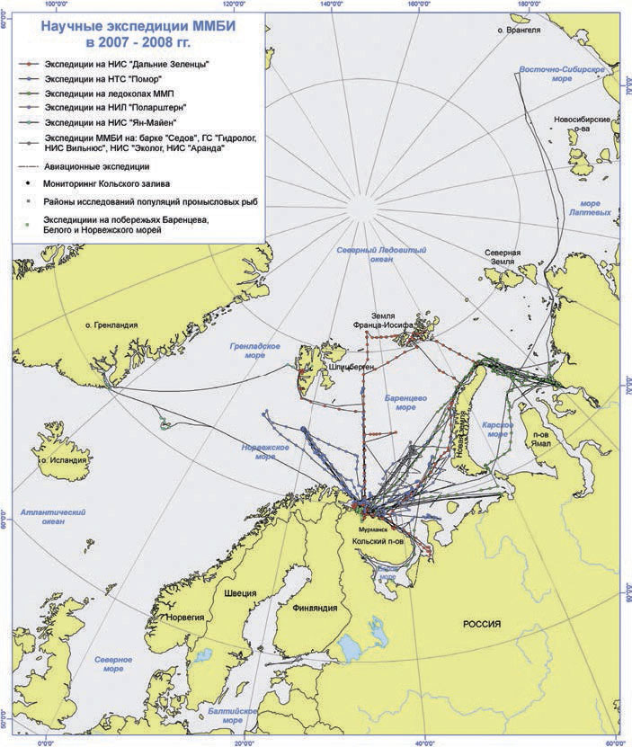 Рис. 1. Экспедиции ММБИ, проведенные в рамках Международного полярного года в 2007–2008 гг.