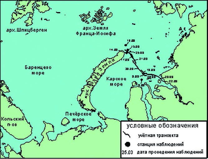 Экспедиция на а/л «Арктика» в марте 2007 годаВ период с 28.02.2007 по 01.04.2007 на борту а/л «Арктика» в Баренцевом и Карском морях были проведены комплексные попутные наблюдения. Основной компонент составили гидрологические наблюдения. На 48 гидрометеорологических станциях с поверхности были отобраны пробы воды на определение солености и температуры. В комплексе с гидрологическими проводились метеорологические наблюдения, а также наблюдения за ледовой ситуацией/состоянием поверхности моря, морскими млекопитающими и птицами. Также в разных частях Карского моря были взяты пробы воды с поверхности на определение уровней химического загрязнения.