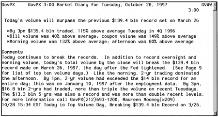 Дневной объем торговли облигациями оценить очень трудно по причине разнообразия характера торговых сделок и отчетности по ним. По данным Ассоциации международного рынка ценных бумаг ISMA, например, средний дневной оборот по еврооблигациям и связанным с ними ценным бумагам в течение недели, завершившейся 1 июля 1999 года, составлял 267,2 млрд долларов. Дневной оборот по сделкам, прошедшим через систему GOVPX, в соответствии с сообщением новостной службы, достигал 70 млрд долларов, при этом реальный объем должен быть существенно больше, поскольку GOVPX отражает данные только по своим участникам.