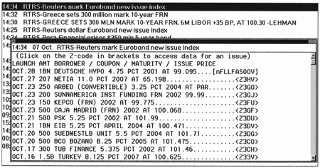 Взгляните на приведенные здесь экраны Reuters, которые отображают комментарий по рынку ценных бумаг Казначейства США и индекс некоторых новых выпусков еврооблигаций.
