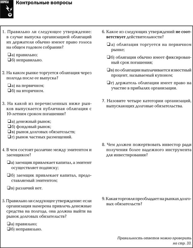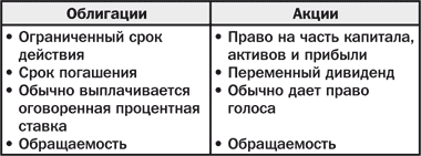 Существует принципиальное различие между рынками облигаций и акций с точки зрения как эмитентов, так и инвесторов. Выпуская акции, организация продает долевую собственность, инвесторы – держатели акций становятся ее совладельцами и, следовательно, могут рассчитывать на вознаграждение, если эта организация приносит прибыль. Организация, выпустившая долговое обязательство, привлекает заемные средства, которые необходимо возвратить полностью с выплатой процента через определенное время. Инвесторы в этом случае обычно знают, какой процент им причитается, а также, что их первоначальные вложения будут возмещены.