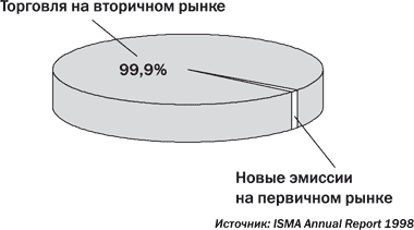 Подавляющую долю рынка долговых обязательств занимает торговля выпущенными инструментами. В 1998 году, по данным ISMA, объем новых выпусков еврооблигаций и международных облигаций в долларовом эквиваленте достиг 1000 млрд, в то время как торговля на вторичных рынках превысила 60 000 млрд долларов.