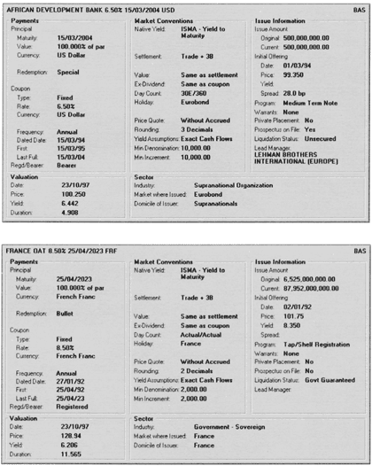 Эти экраны Reuters отображают детальную информацию по правительственным и наднациональным облигациям.