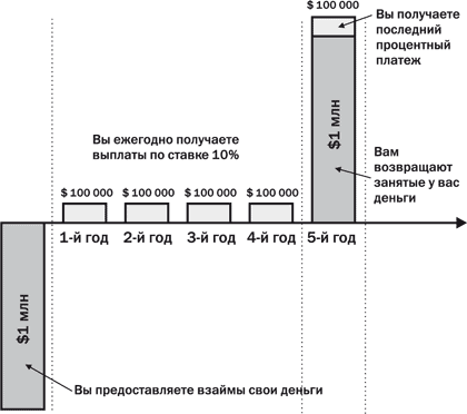 Допустим, вы покупаете облигацию с номинальной стоимостью 1 млн долларов и сроком погашения пять лет. Облигация имеет купонную ставку 10 %, выплачиваемую раз в год. Платежи по облигации в течение всего ее срока будут выглядеть следующим образом: